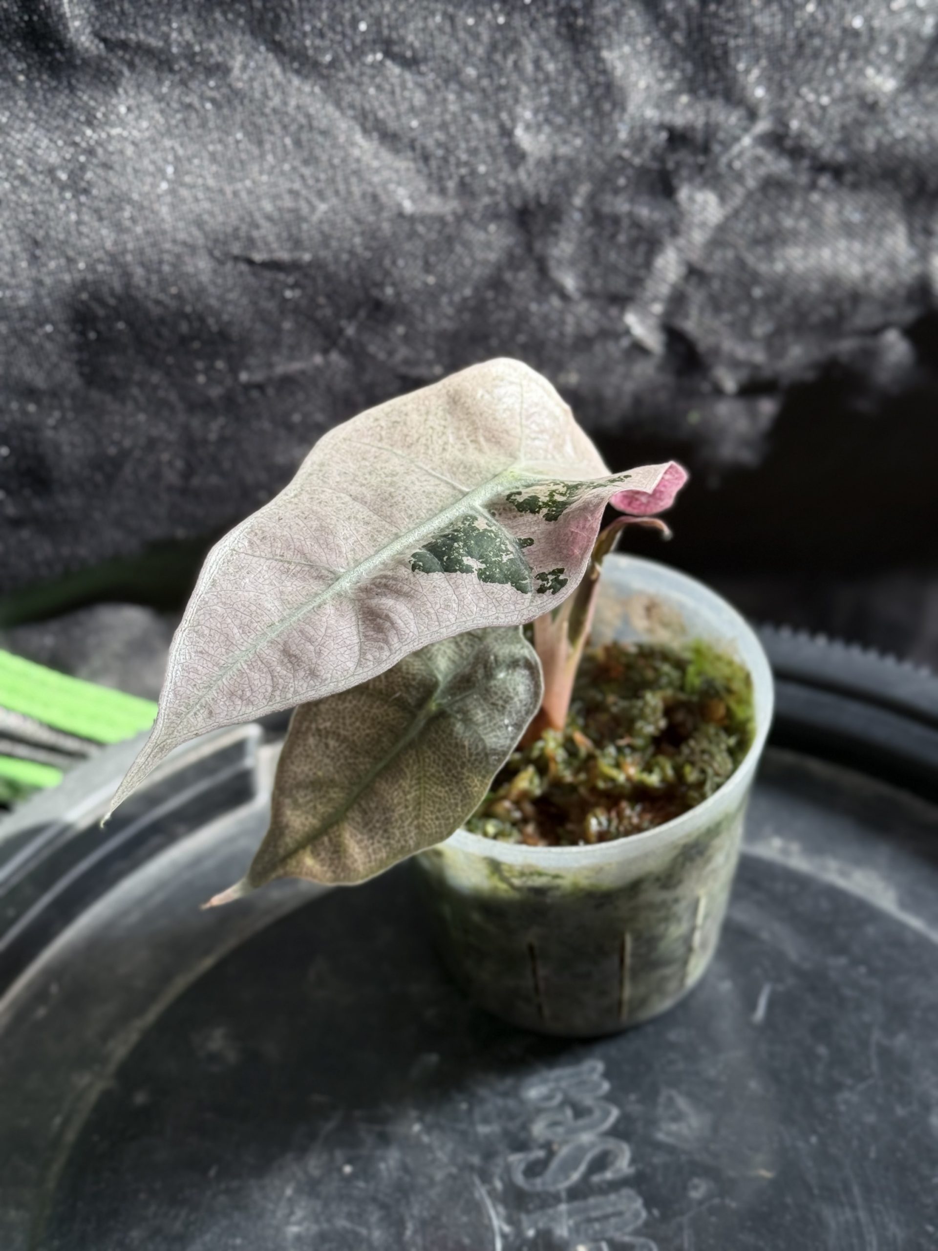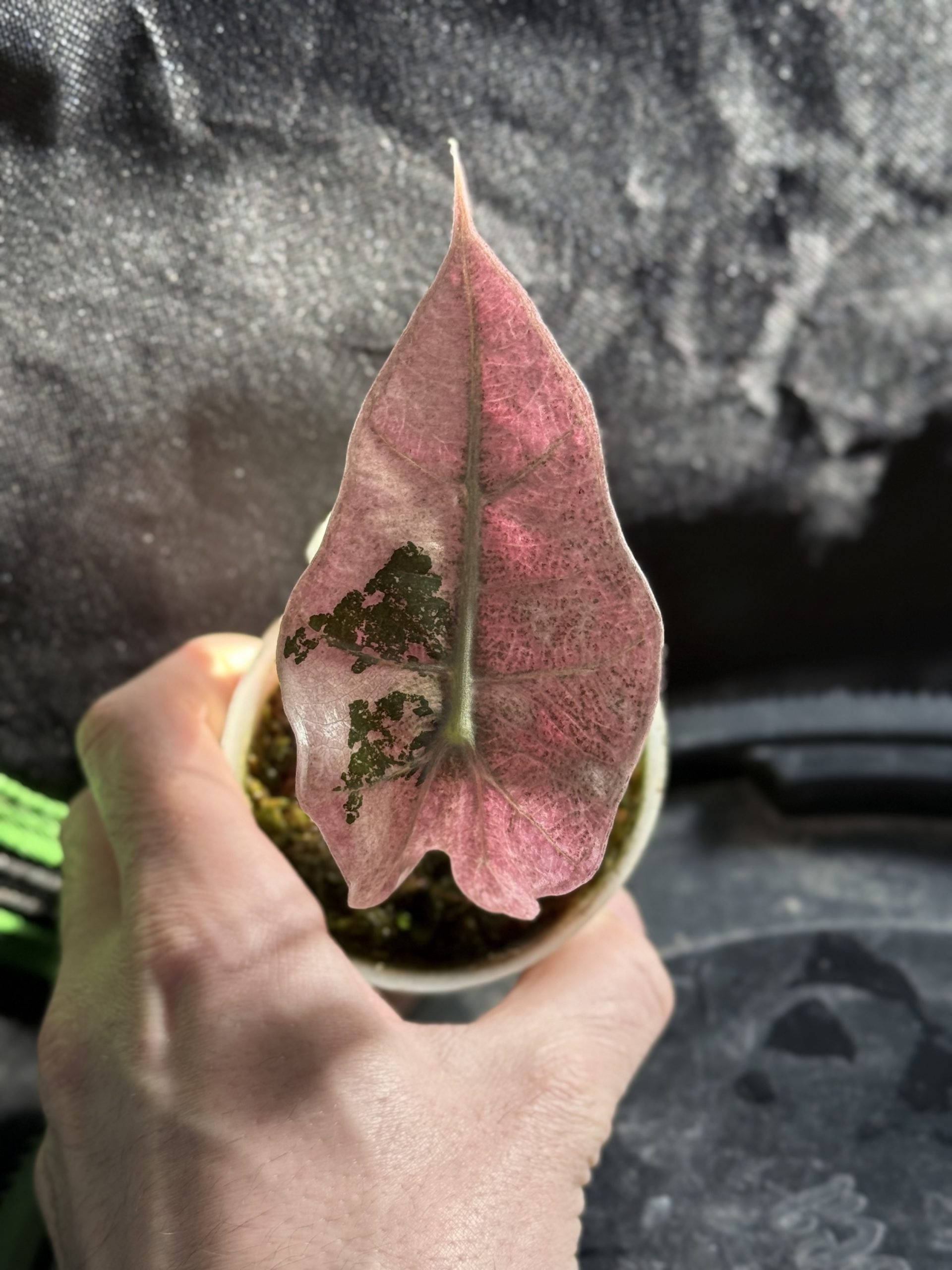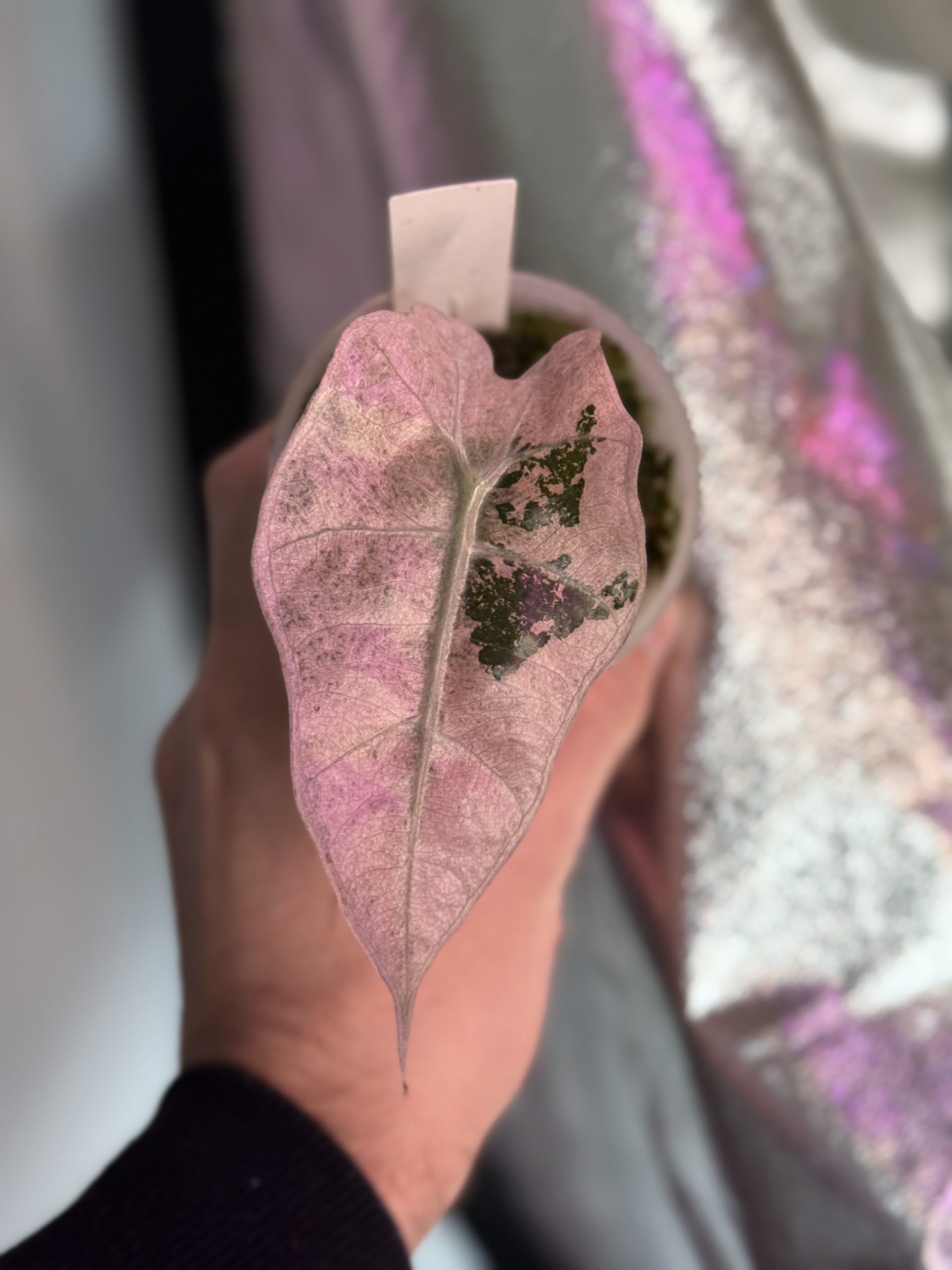 Angeboten wird eine Alocasia Amazonica Pink Mint Variegata. Sie wurde aus einer Knolle gezogen (kein TC!).