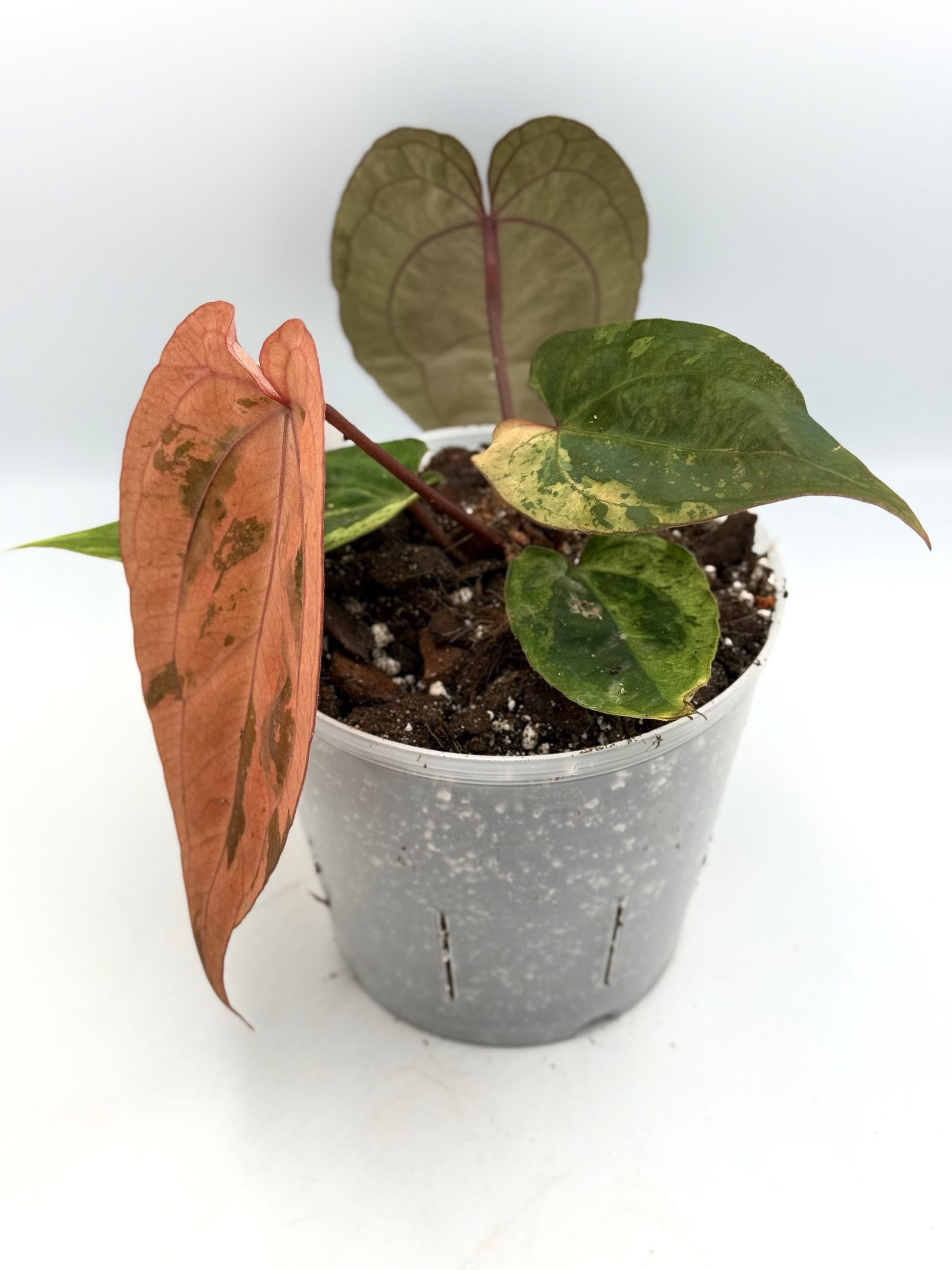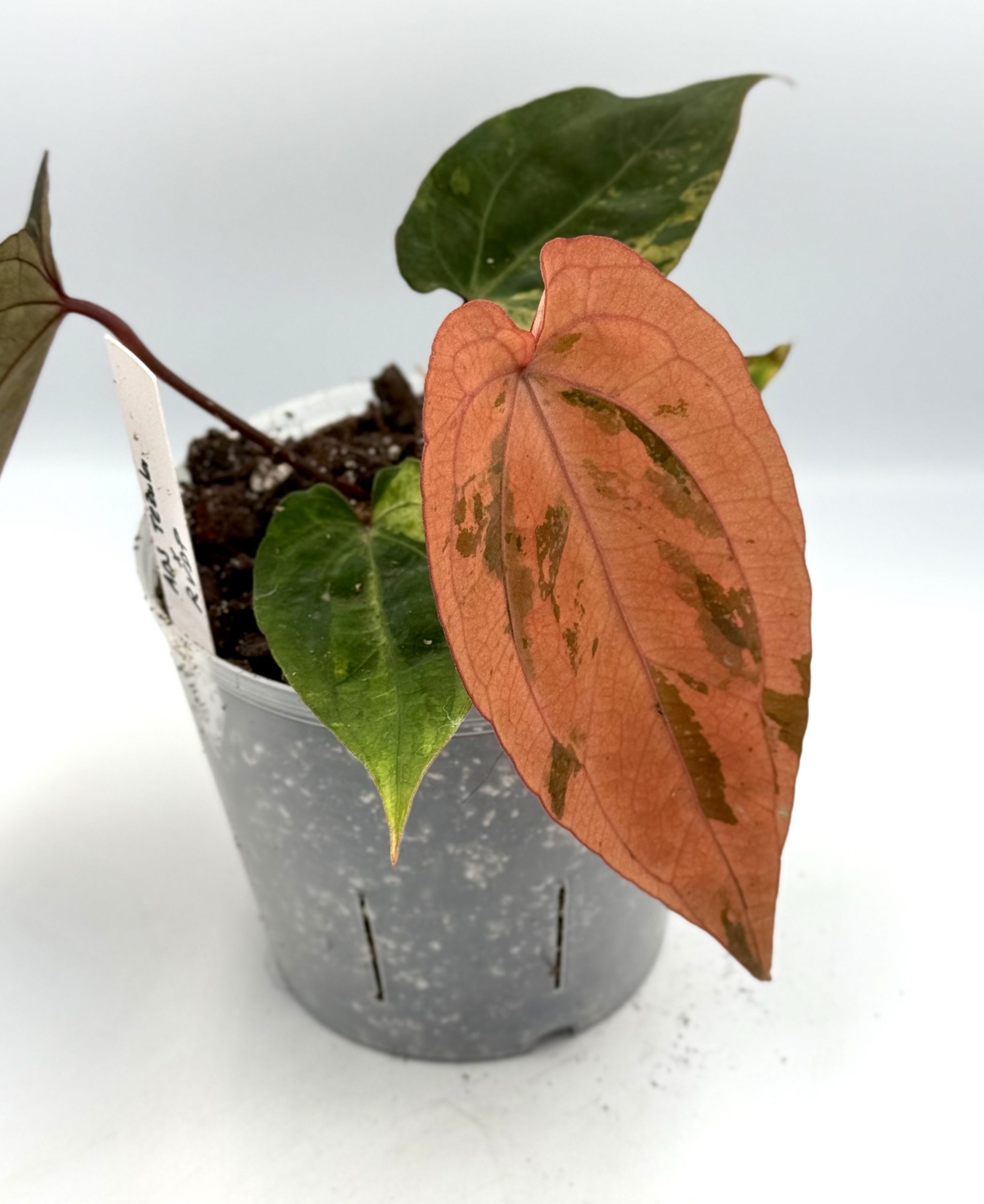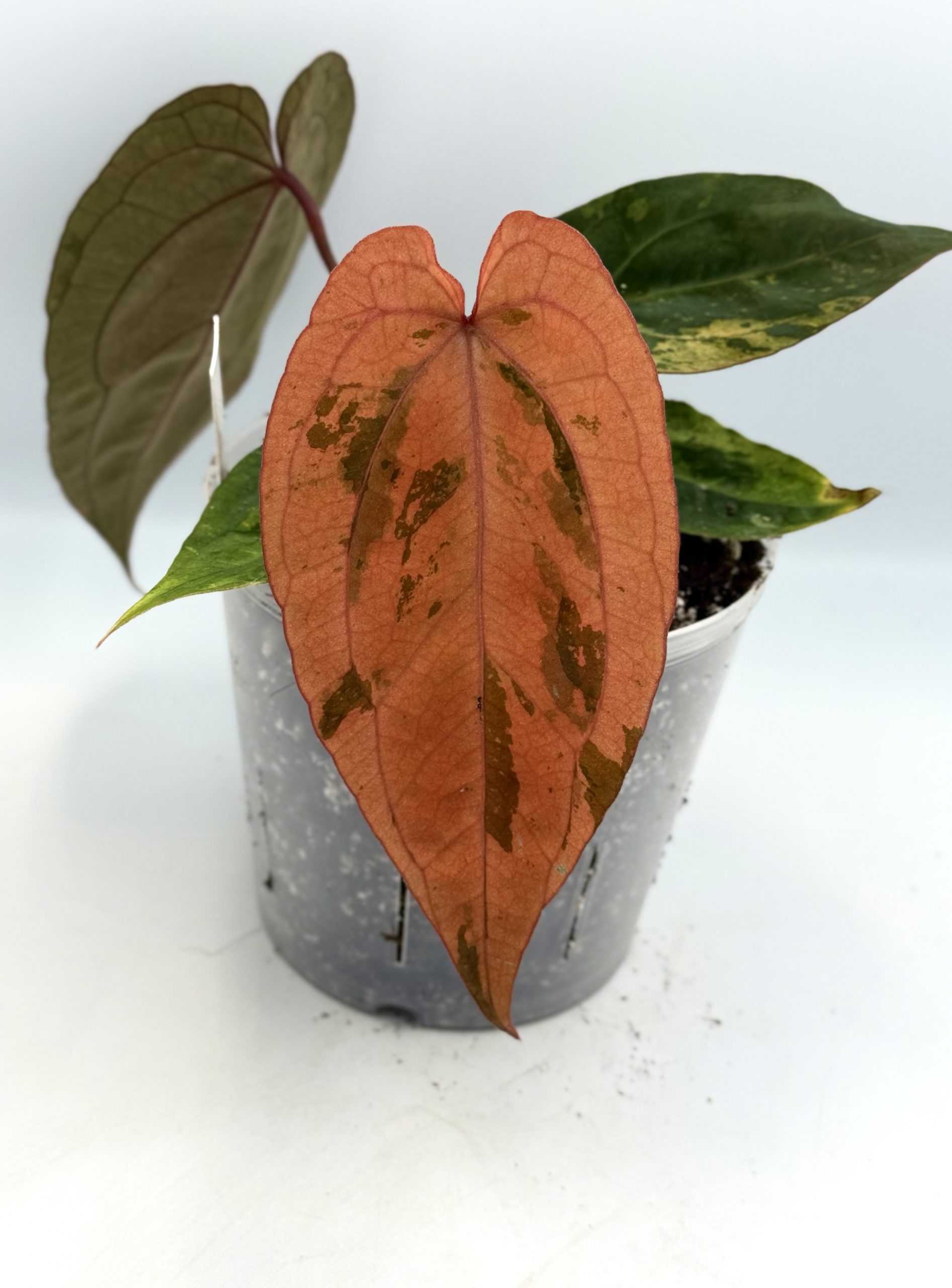 Wunderschöne Anthurium Ace of Spades Tezula x Red Vein Dark Phoenix. Ein variegiertes Exemplar dieser Kreuzung wird zum Verkauf angeboten.