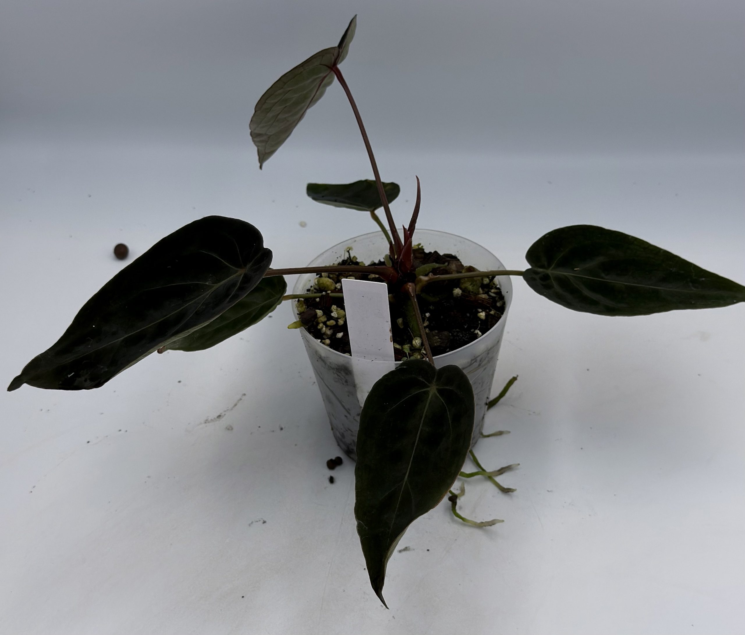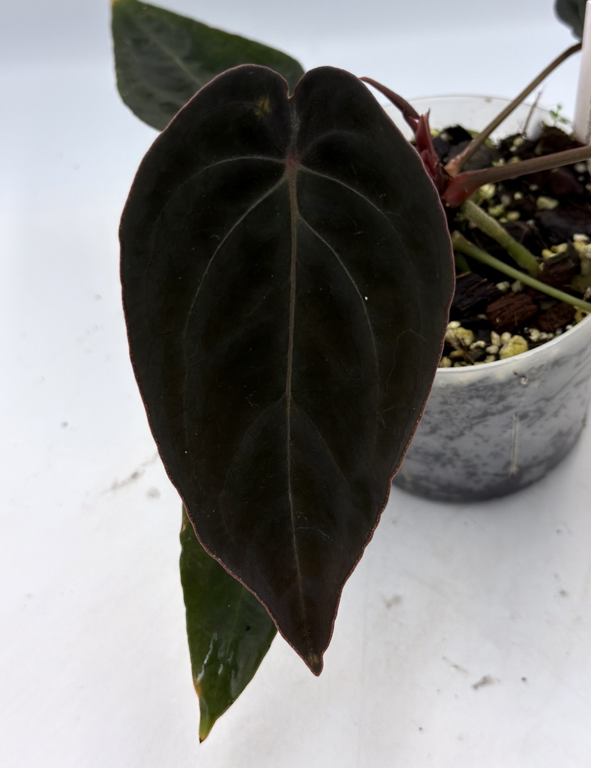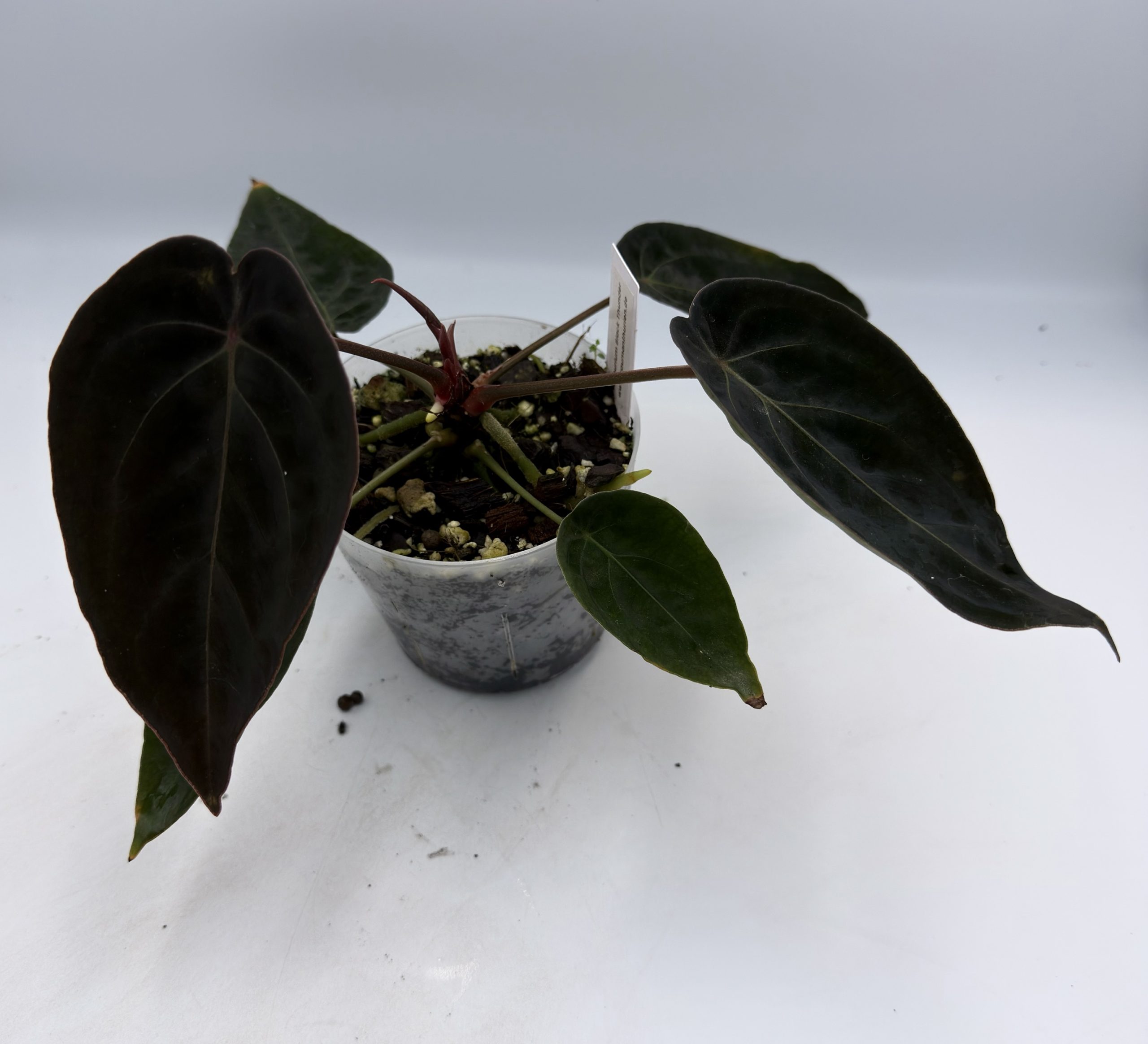 Angeboten wird eine Anthurium “Black Thunder” – eine eigene Selektion aus einer Labor-Testreihe. Die genaue Abstammung ist daher nicht eindeutig bestimmbar.